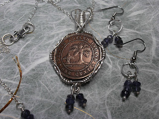 The coins are 1855, I think, with Queen Victoria on the flip side, and the little blue stones are iolite, known as the "navigator" stone. Rather fitting for an Island coin.